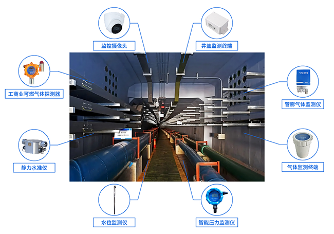 综合管廊:顺利获得部署管廊气体监测仪、水位传感器、温湿度传感器,智能压力监测仪等各监测设备实时监测管廊内的环境参数,当环境参数超出安全范围时,及时发出预警,提醒管理人员采取相应的措施,确保管廊内工作人员的安全。对管廊的结构变形、位移、应力等参数进行长期监测,以保障城市地下综合管廊的安全运行。
