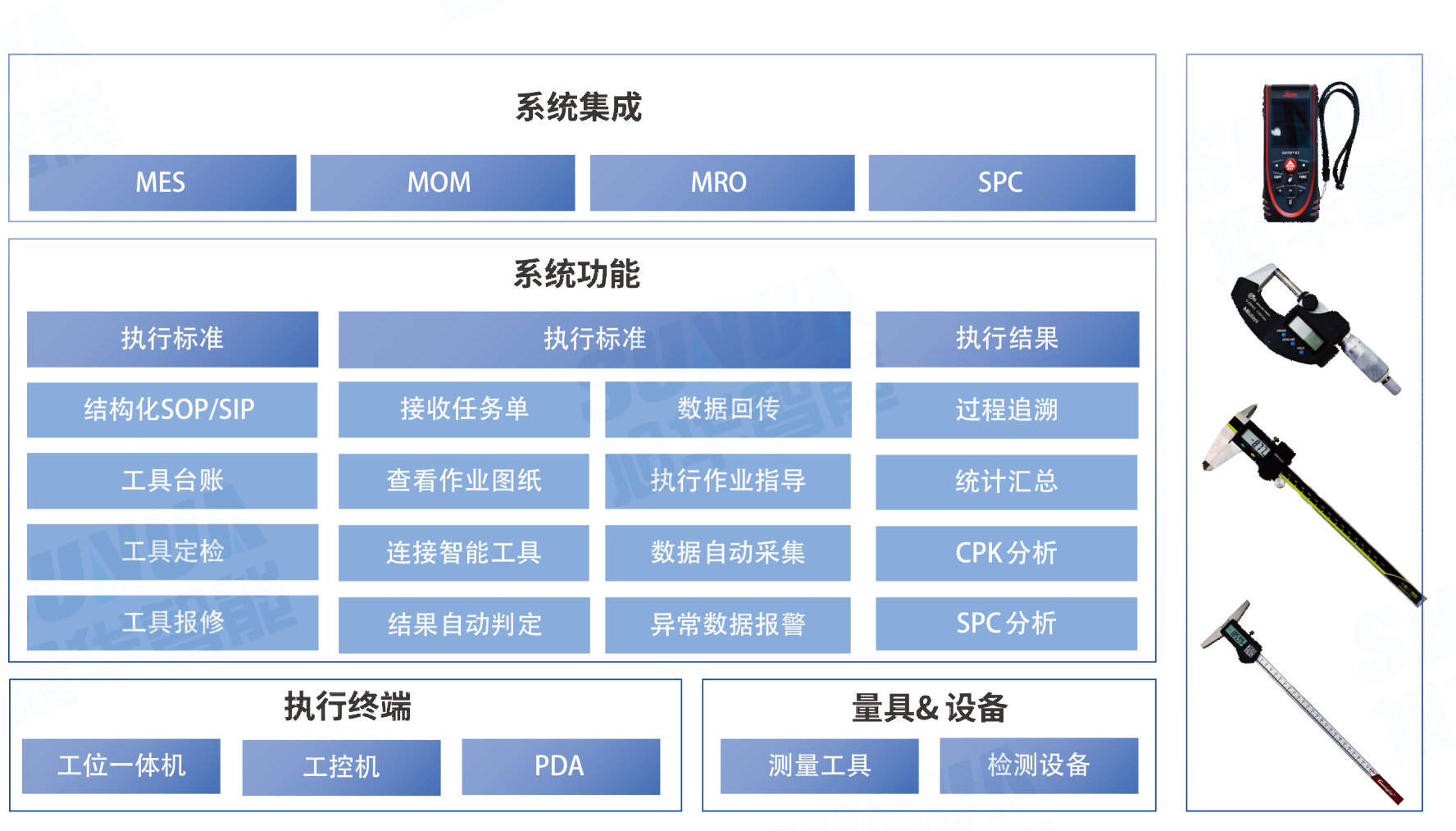 测量采集系统包括量具、检测设备等硬件作业人员可以根据作业指导书或检验指导书中的要求选择正确的智能量具、检测设备进行规范作业,实现测量数据无感知自动采集与结果判定,确保作业数据真实可靠。